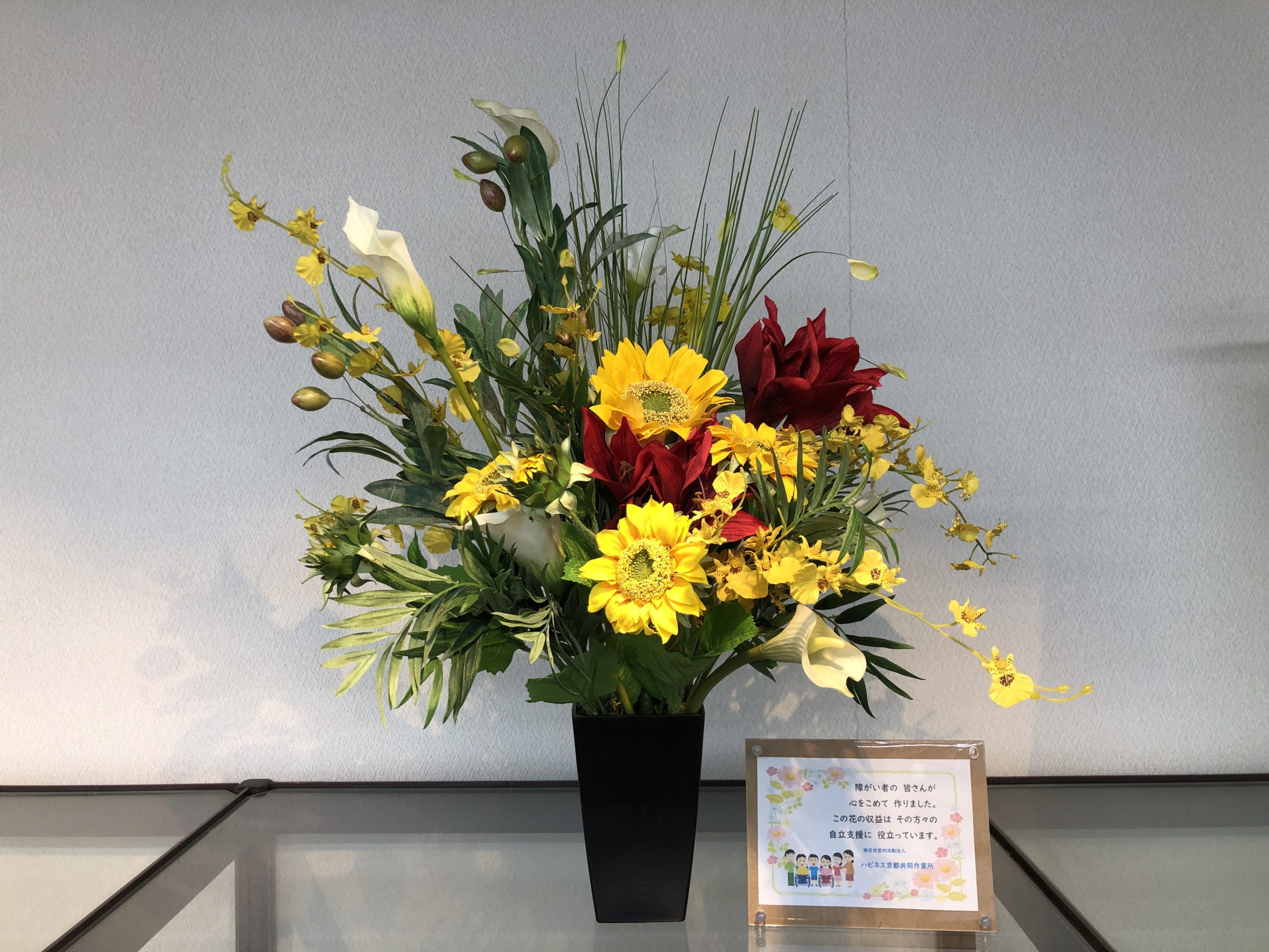 花のレンタル(夏アレンジ) 自主製品 2021.07.14 2021.07.10 ハピネス京都共同作業所では、自主製品の一つとしてシルクフラワーを使ったフラワーアレンジメントのレンタルをしています。春・夏・秋・冬の年4回アレンジメントの交換をして、四季折々の花の姿を楽しんでいただけます。家やお店の玄関にいかがでしょうか。レンタルをご希望の方は、是非ご連絡ください。