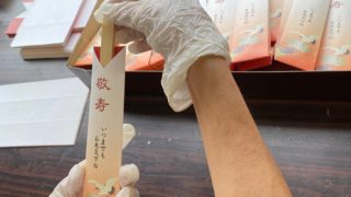 お箸の袋づくりをしています。 お正月や敬寿など、さまざまなお祝い事に使っていただくお箸です。